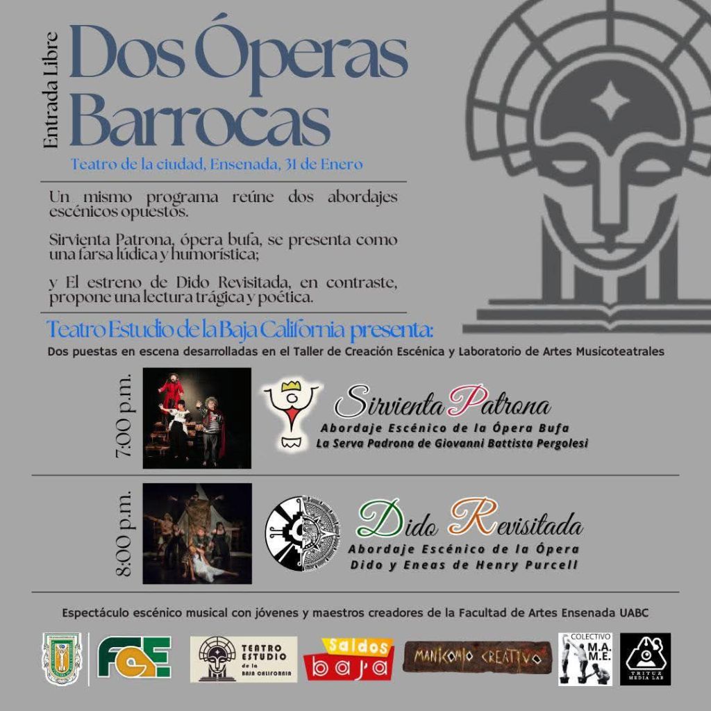 Dido Revisitada, todavía está en proceso y parte de ello es el entrenamiento frente al público por lo que este sábado 31 de enero 2026, se presentará en el Teatro de la Ciudad de Ensenada B C a las 8 pm. Sin embargo, le precederá a las 7pm la Sirvienta Patrona, otro abordaje escénico, del cual ya tenemos antecedente. Por lo que es una excelente oportunidad para dedicar un sábado operístico propio del espíritu del Taller de Creación Escénica Y Laboratorio de las Artes Musicoteatrales de la Universidad Autónoma de Baja California.